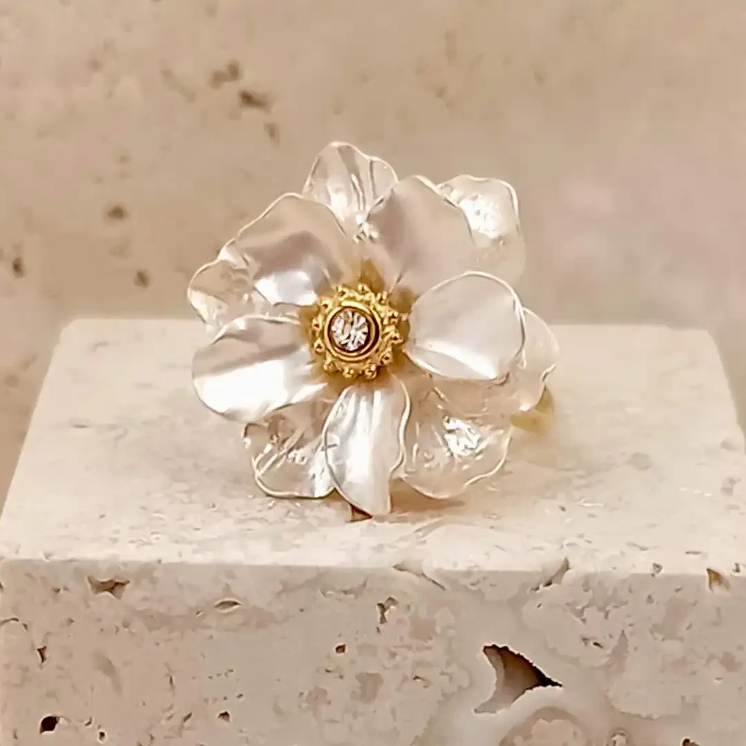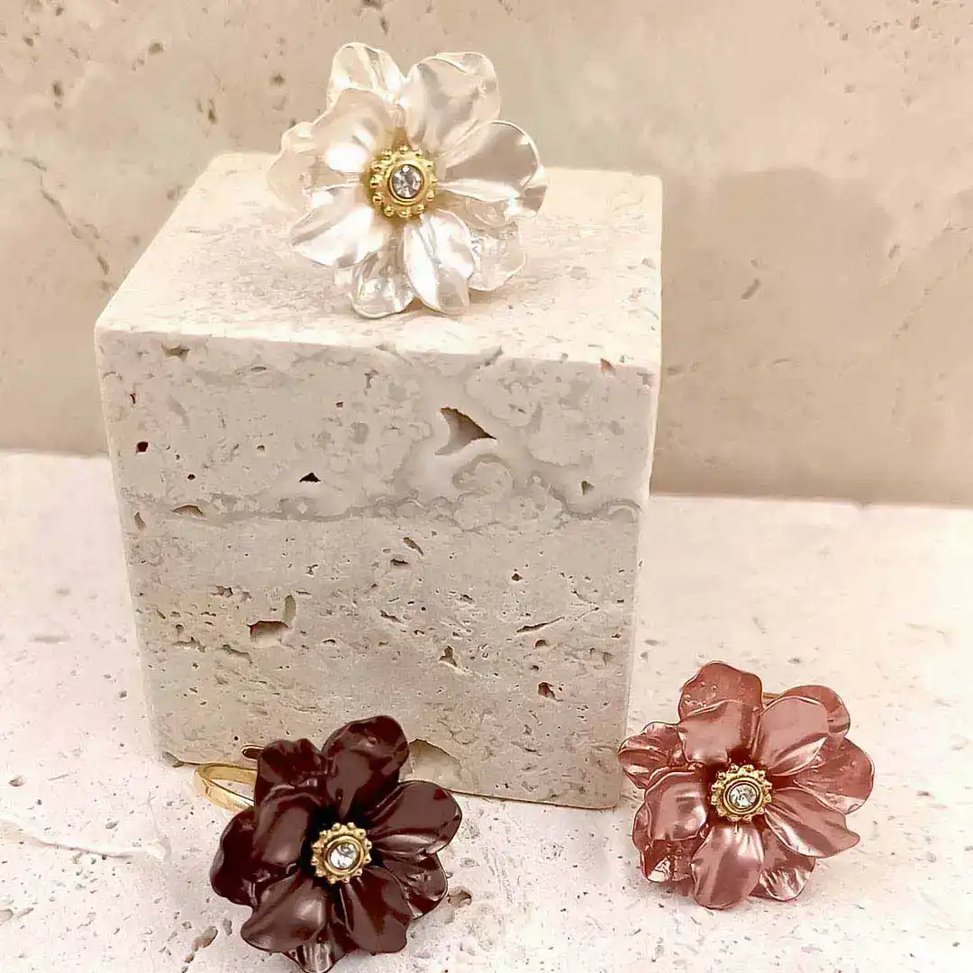 Bague ajustable fleur en résine et acier inoxydable, disponible en blanc, rose et marron avec strass centralBague Ajustable Acier Inoxydable Fleur en Résine – Charme Floral Irrésistible