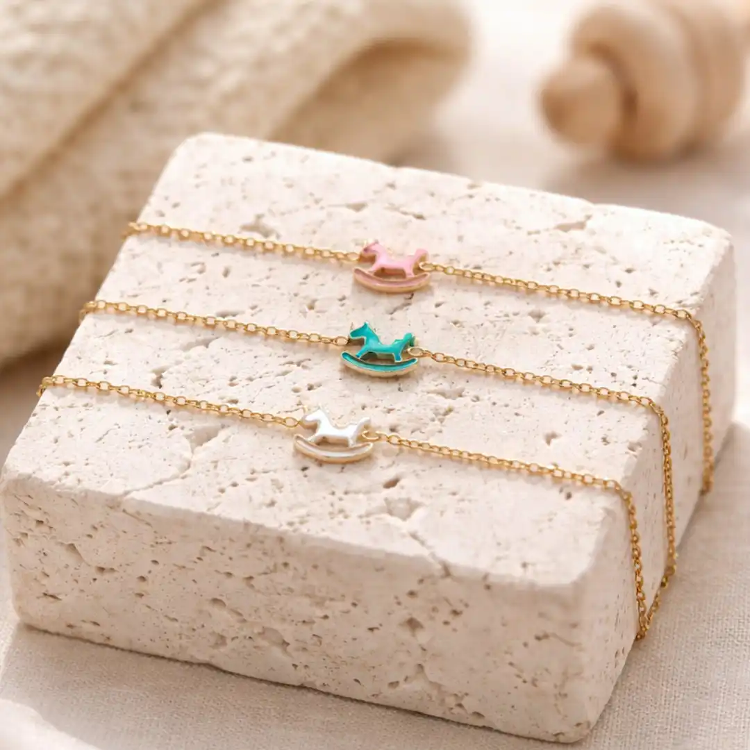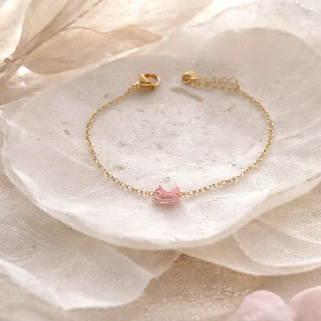 Ce bracelet enfant acier inoxydable doré est bien plus qu’un accessoire : c’est un symbole de douceur et d’innocence. Son délicat cheval à bascule émaillé (rose, bleu ou blanc) évoque l’univers magique de l’enfance et illumine le poignet avec élégance.