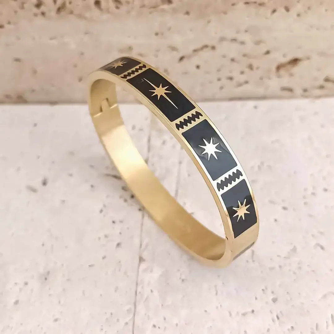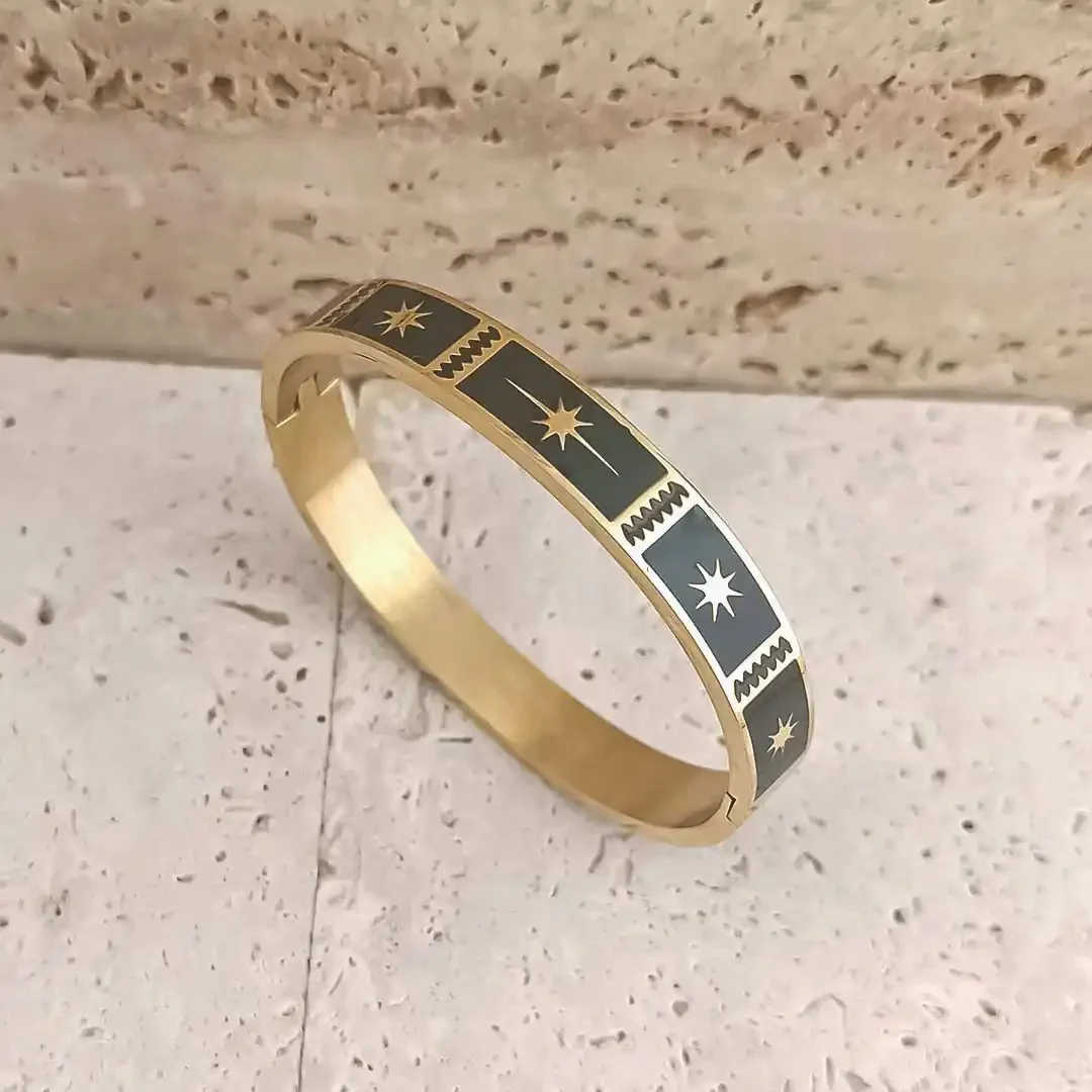 Le bracelet jonc en acier doré émaillé se distingue par son design graphique et équilibré. Son allure à la fois moderne et chic s’adapte à tous les styles : casual, bohème, élégant ou urbain.