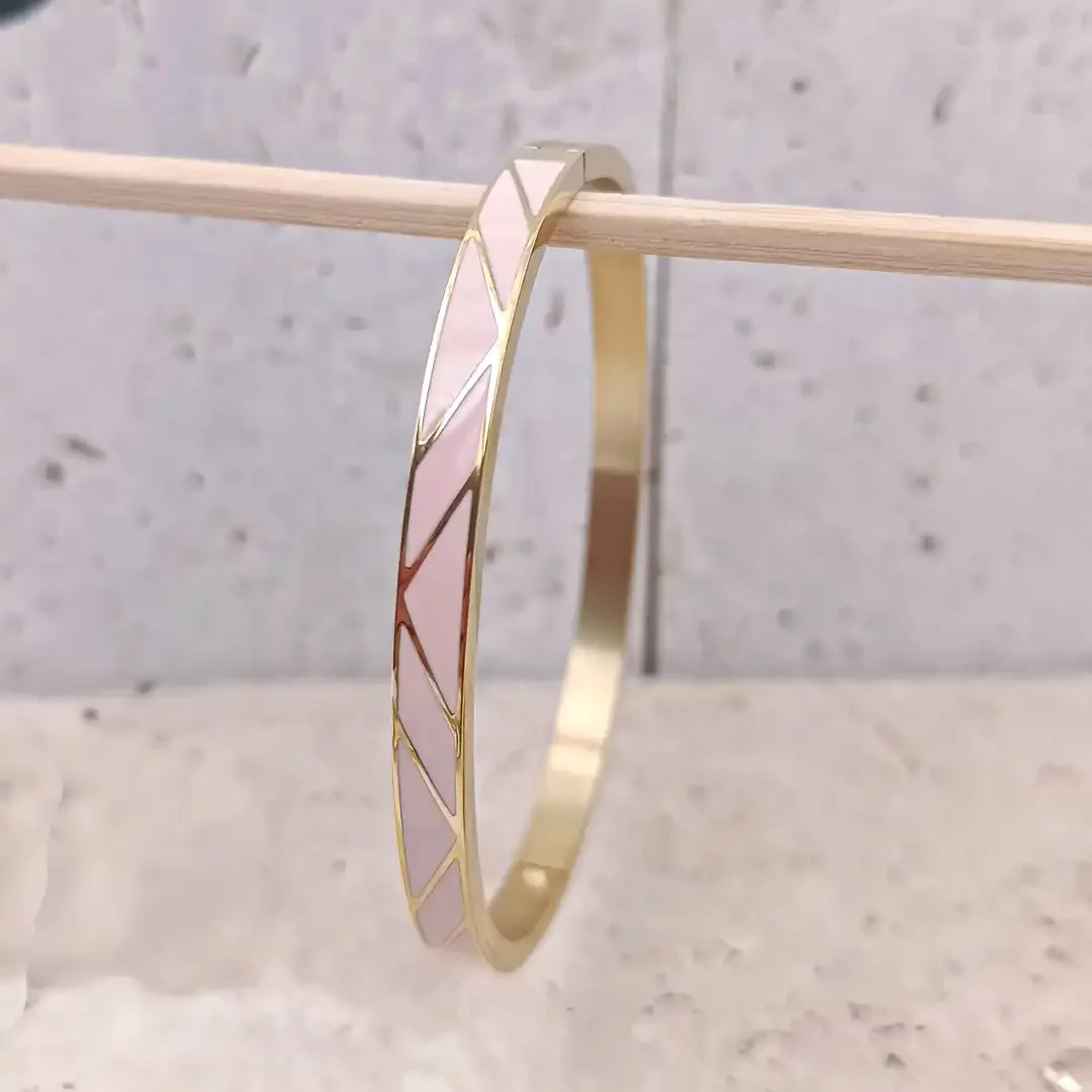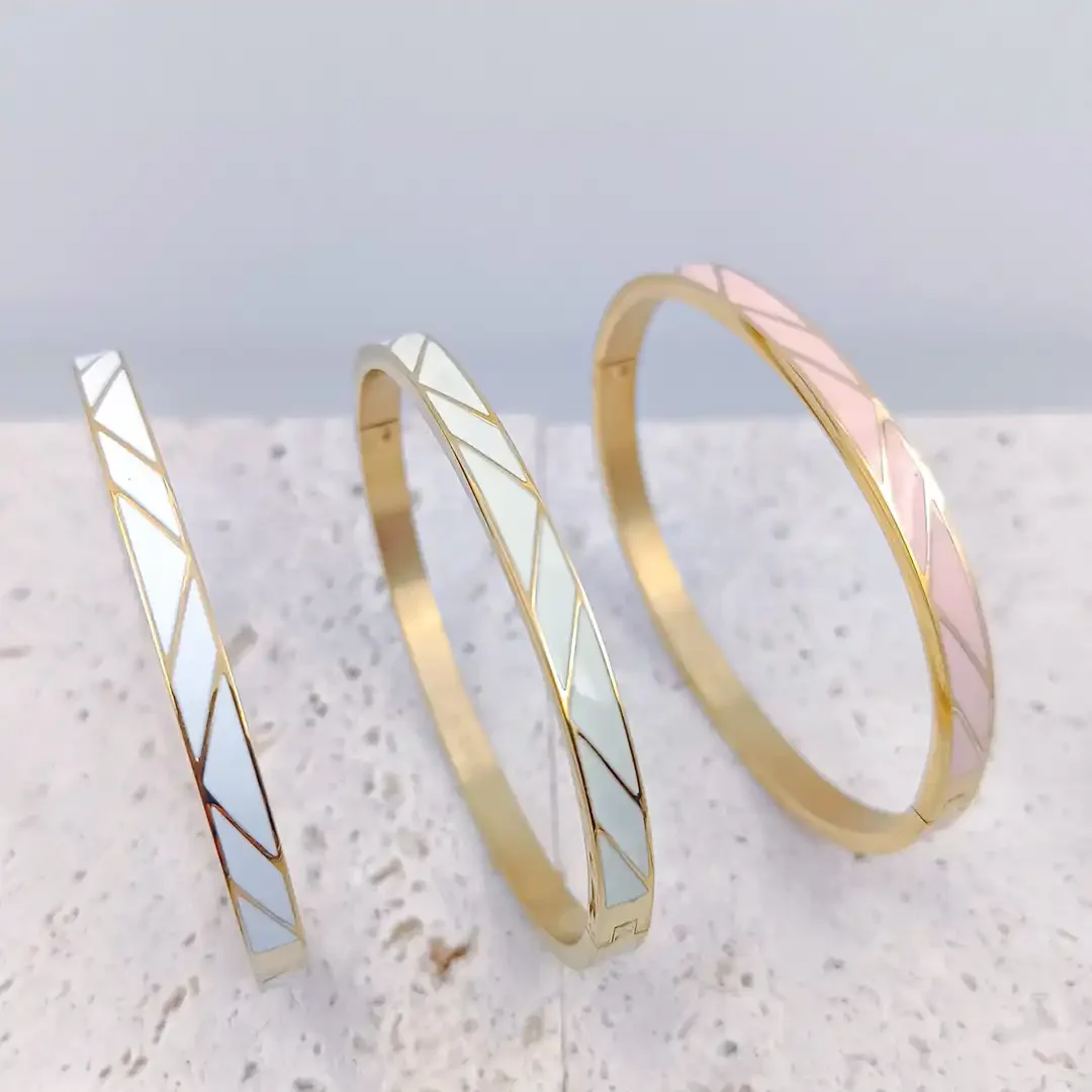Le bracelet jonc en acier doré émaillé est un bijou raffiné qui séduit par son design moderne et élégant. Grâce à son motif géométrique en triangles colorés et à ses finitions soignées, il se distingue comme un véritable incontournable de la bijouterie tendance. Disponible en deux coloris sobres et élégants – blanc lumineux, créme douceur et un rose chaleureux –, ce bracelet se porte facilement au quotidien comme lors d’occasions spéciales.