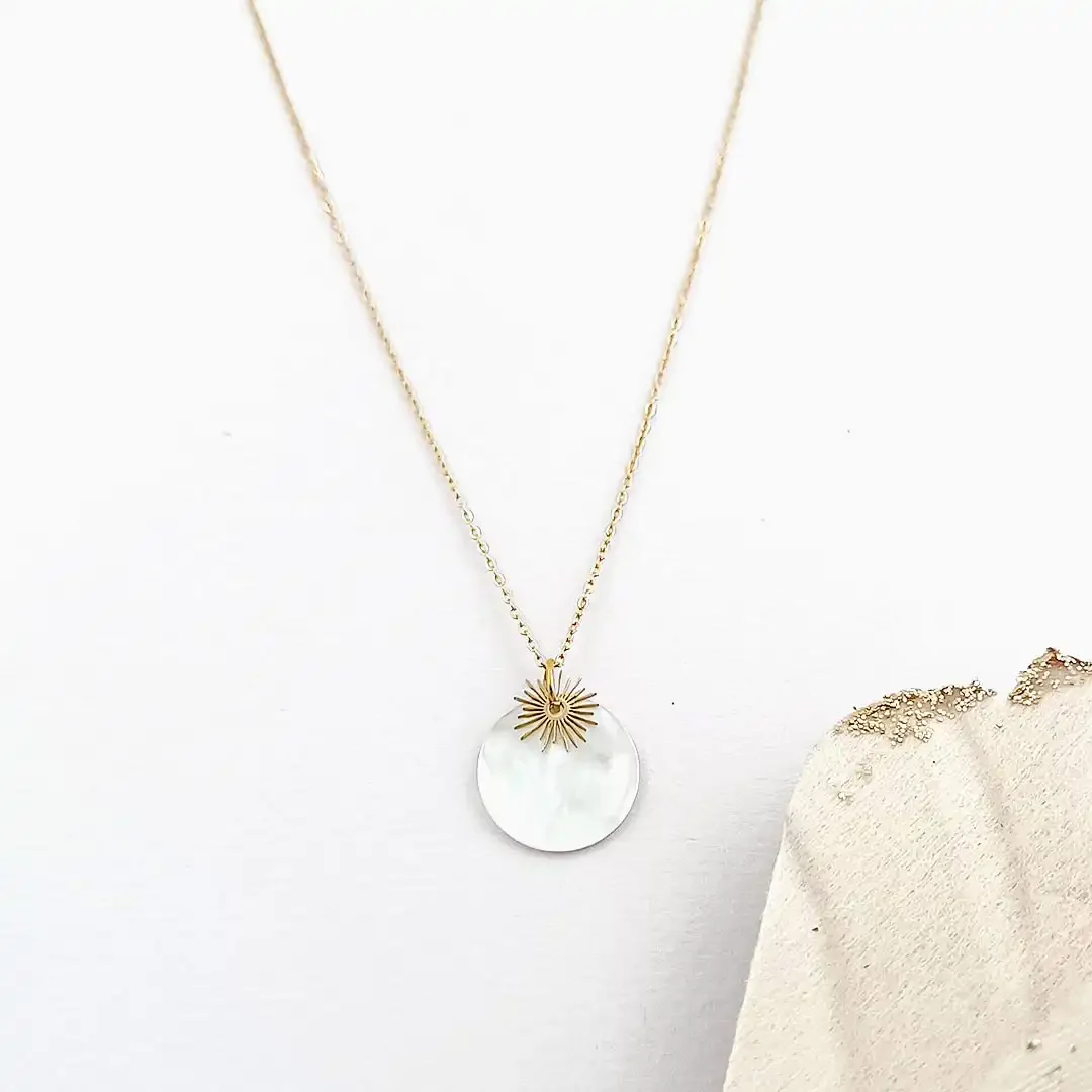 Le pendentif se présente sous la forme d’une pastille ronde en nacre naturelle de 1,6 cm de diamètre, sublimée par un délicat motif soleil doré. L’ensemble est conçu pour offrir un équilibre parfait entre finesse, élégance et confort.